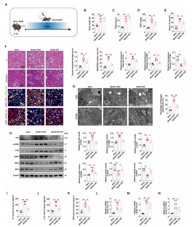 8.DUSP1在肾小管上皮细胞(TECs)中的过表达可恢复线粒体功能并减轻db/db小鼠的肾纤维化。
