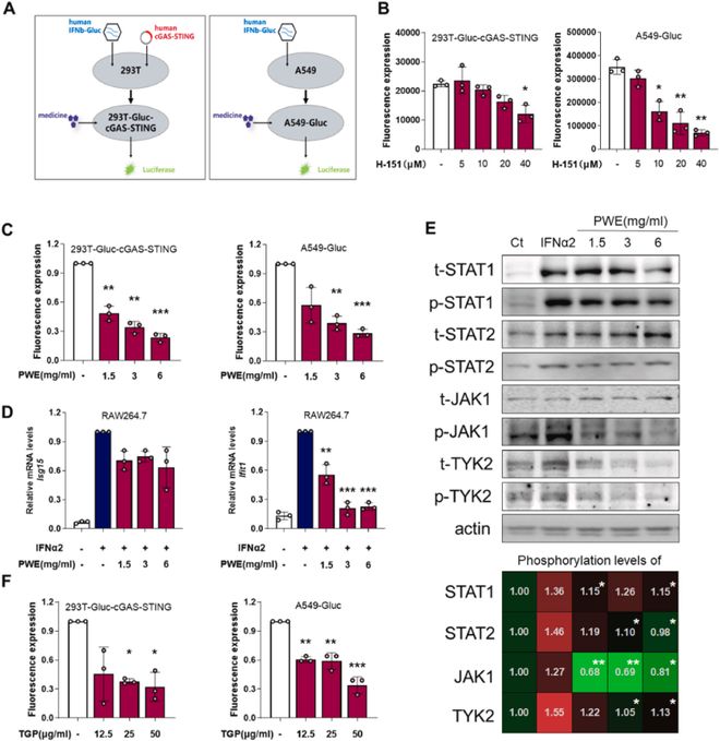 科研人员构建了一个荧光素酶(Gluc) 报告基因检测系统,以从中药配方SNS中鉴定具有抗I型IFN活性的成分。并在RAW264.7细胞中,采用实时PCR(RT-PCR) 和Western blotting研究I型IFN通路的变化。此外,在博来霉素(BLM,AbMole,M13641)诱导的小鼠硬化症模型中,通过RT-PCR测量纤维化基因、I型IFN相关基因、炎性细胞因子的表达,并通过H&E染色、Masson染色和免疫组织化学分析确定组织病理学变化。最终结果表明芍药总葡萄糖苷 (TGP) 是SNS的生物活性成分,它选择性抑制TLR3介导的I型IFN反应并阻断I型IFN诱导的下游JAK-STAT信号通路。在动物实验中,TGP通过抑制I型IFN信号传导上游和下游的多个靶点来改善皮肤纤维化。在构建荧光素酶检测系统中,科研人员使用了由AbMole提供的Puromycin(嘌呤霉素,AbMole,M3637)用于细胞转染后的筛选[3]。