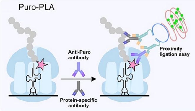 翻译水平的调节是重要的基因表达调控机制之一,涉及mRNA翻译因子、核糖体蛋白、RNA结合蛋白和非编码RNA的表达以及、和选择的调节变化。Puromycin(嘌呤霉素,AbMole,M3637)是一种研究蛋白翻译的重要工具,当在细胞培养体系中以低浓度加入嘌呤霉素时,它能够特异性地掺入到新合成的肽链中。这一过程就像是给上述肽链贴上了一个特殊的“标签”,科研人员可以通过追踪这个“标签”来了解蛋白质合成的动态过程,通过可以特异性识别Puromycin的抗体进行免疫印记和免疫荧光等方式检测蛋白翻译的动态过程。此外,基于嘌呤霉素的检测与邻位连接(PLA) 检测的结合(Puro-PLA),实验人员可以检测特异性mRNA的翻译。Puro-PLA:目的蛋白抗体和Puromycin的抗体各带有一段可以互补的核苷酸序列,当Puromycin作用于目的肽链上时,与目的蛋白的新生肽链间距较近,随后加入上述两种抗体,此时上述的两段核苷酸就会互补配对,随后通过滚环扩增(RCA)产生可检测的信号。